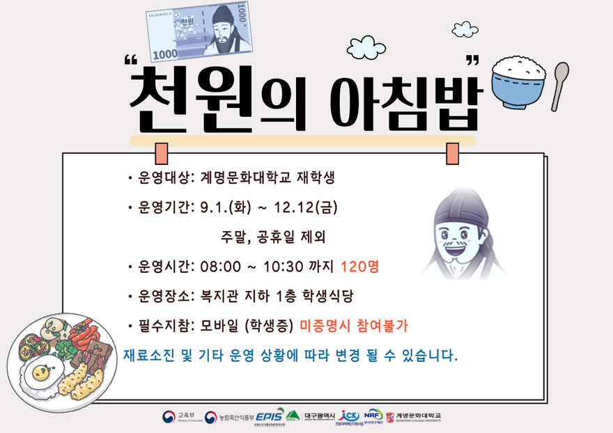 농림축산식품부와 농림수산식품교육문화정보원에서 쌀 소비 활성화와 관련하여 아침식사 결식률이 높은 학생들에게 저렴한 비용부담으로 아침밥을 제공하여 건강과 복지증진에 기여하고자 천원의 아침밥 사업을 추진하고 있습니다.