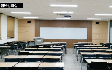 이론강의를 위한 전용강의실로 전자교탁, 빔프로젝트, 전동스크린, 멀티미디어시스템, 냉난방시스템, 초고속 인터넷 설치