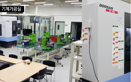 금속가공실습로서 CNC선반, 머시닝센터, 소형밀링머신, 소형선반, 복합밀링머신, 범용선반, 드릴링머신 등 가공장비를 구비하고 있으며, 실습실 내 항온항습, Air배관, 냉온수 및 동력전원이 공급됨