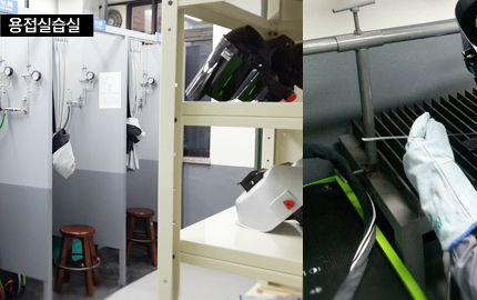 금속용접실습실로서 아크용접, 가스용접 및 특수용접을 위한 Ar용접, CO2 용접실이 있으며 용접용 각종 측정기구 및 보호장치를 구비하고 용접가스배출을 위한 자동환기장치, 소방장치가 설치되어 있음.